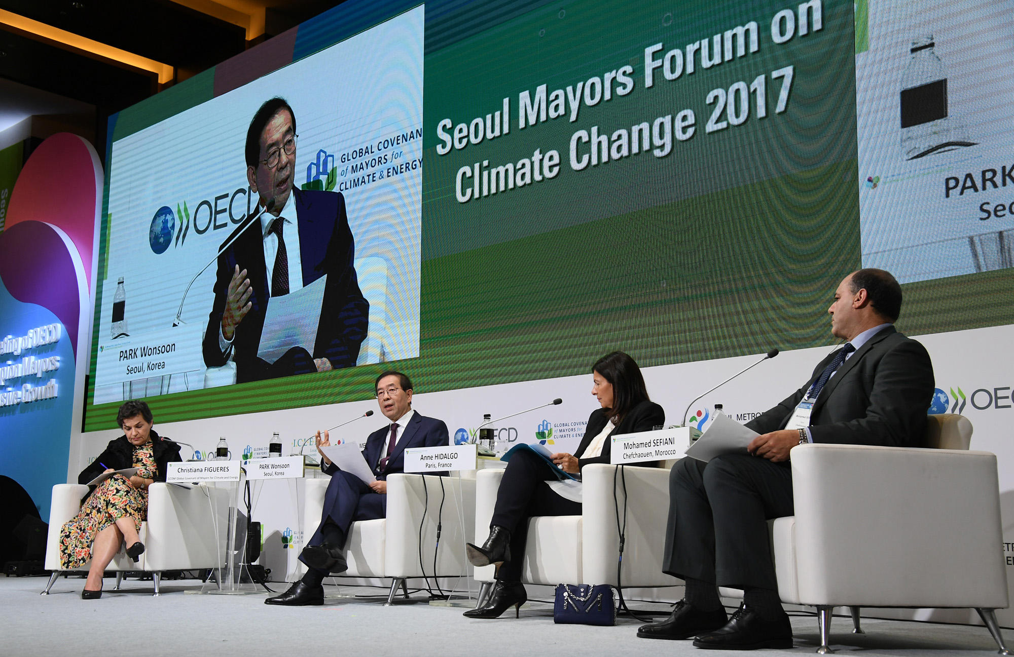 박원순 서울시장이 20일 서울 영등포구 여의도 콘래드호텔에서 열린 '2017 기후변화 대응을 위한 세계도시 시장포럼'에서 발언하고 있다. 서울시 제공