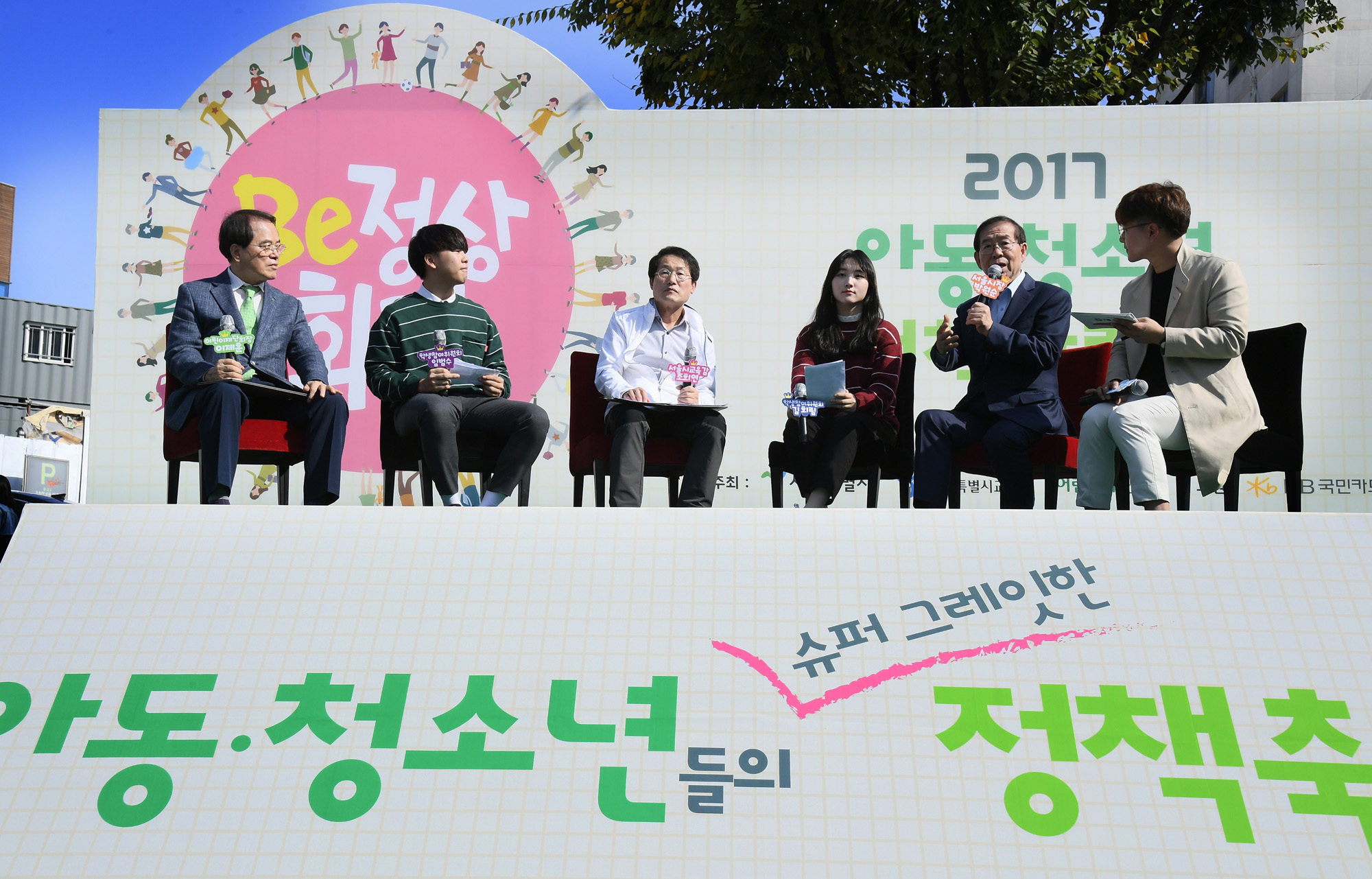 박원순 서울시장과 조희연 서울시교육감이 21일 오후 서울 마포구 홍대 앞 걷고싶은 거리에서 열린 '2017 아동.청소년 정책박람회(Be정상회담)'에 참석해 정책 현실화 방안 강구 대화를 나누고 있다. 서울시 제공