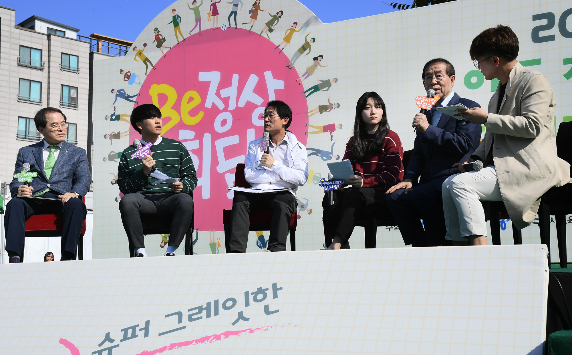 박원순 서울시장과 조희연 서울시교육감이 21일 오후 서울 마포구 홍대 앞 걷고싶은 거리에서 열린 '2017 아동.청소년 정책박람회(Be정상회담)'에 참석해 정책 현실화 방안 강구 대화를 나누고 있다. 서울시 제공