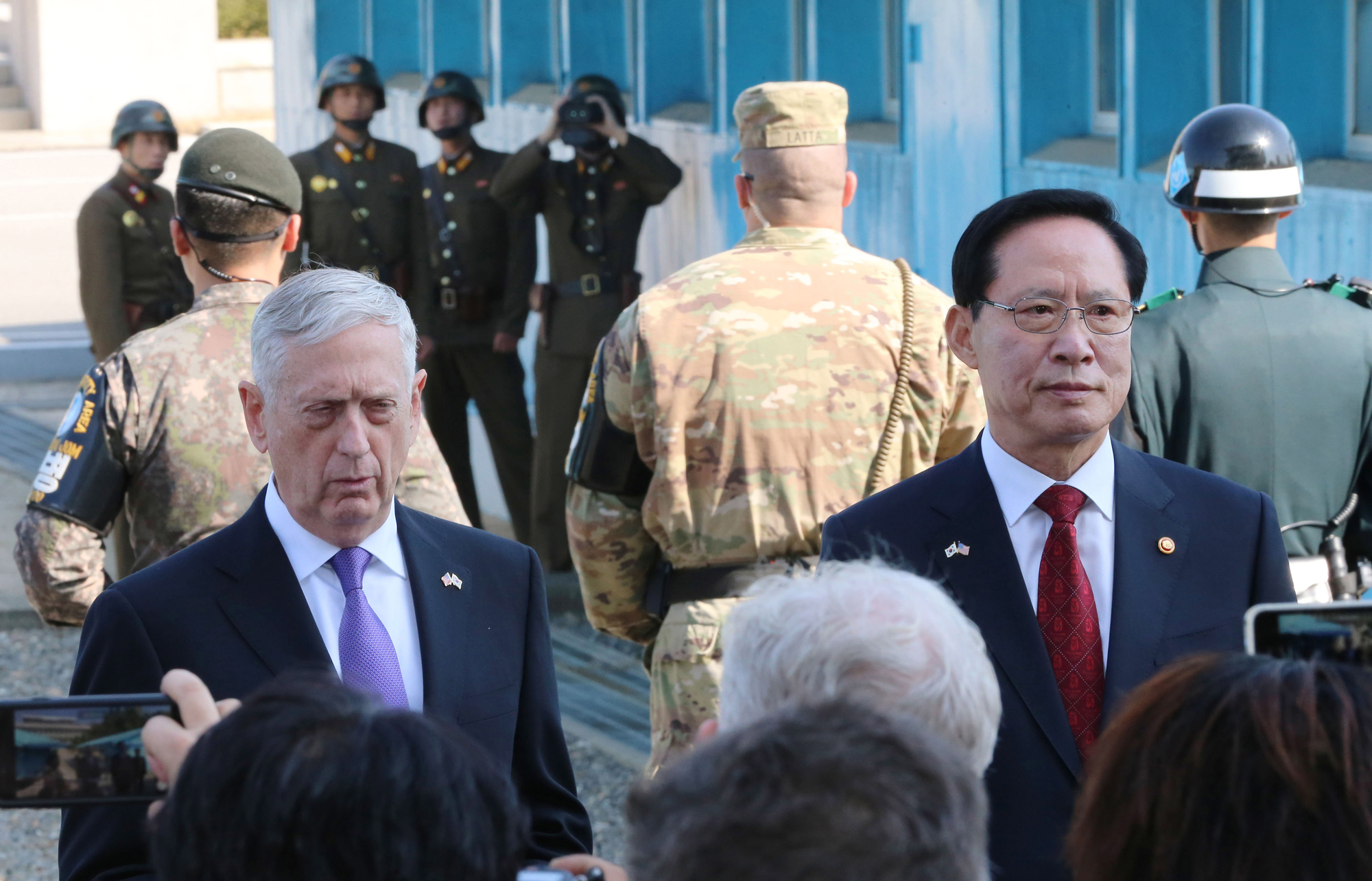 송영무 국방부 장관과 제임스 매티스 미국 국방부 장관이 27일 오후 경기도 파주 판문점 공동경비구역(JSA)에서 대북 메시지를 발표하고 있다. 그 뒤로 북한 판문각에서 외국인 관광객들이 남측을 바라보고 있다. / 2107.10.27 사진공동취재단/