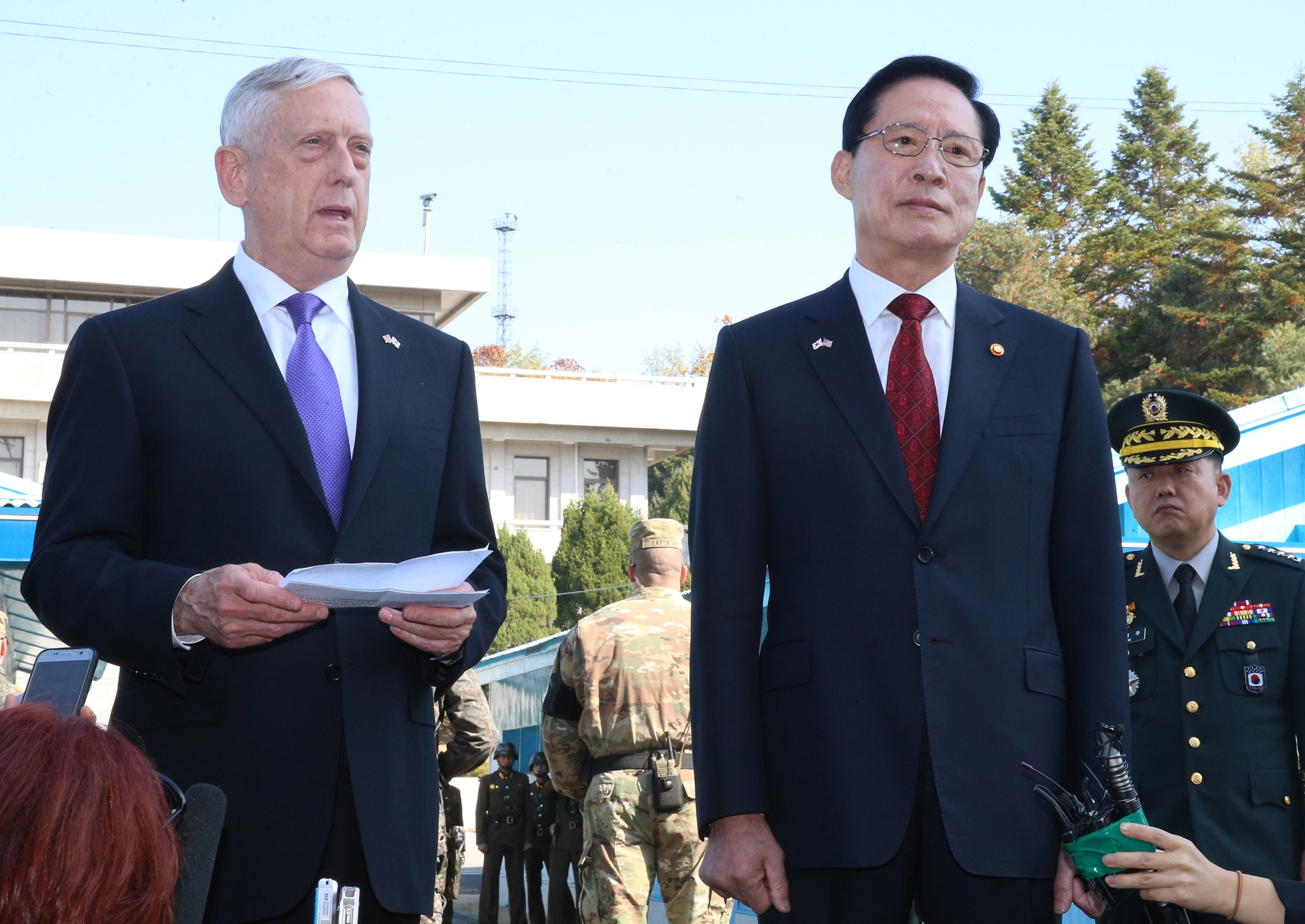송영무 국방부 장관과 제임스 매티스 미국 국방부 장관이 27일 오후 경기도 파주 판문점 공동경비구역(JSA)에서 대북 메시지를 발표하고 있다. 그 뒤로 북한 판문각에서 병사들이 남측을 경계하고있다. / 2107.10.27 사진공동취재단/