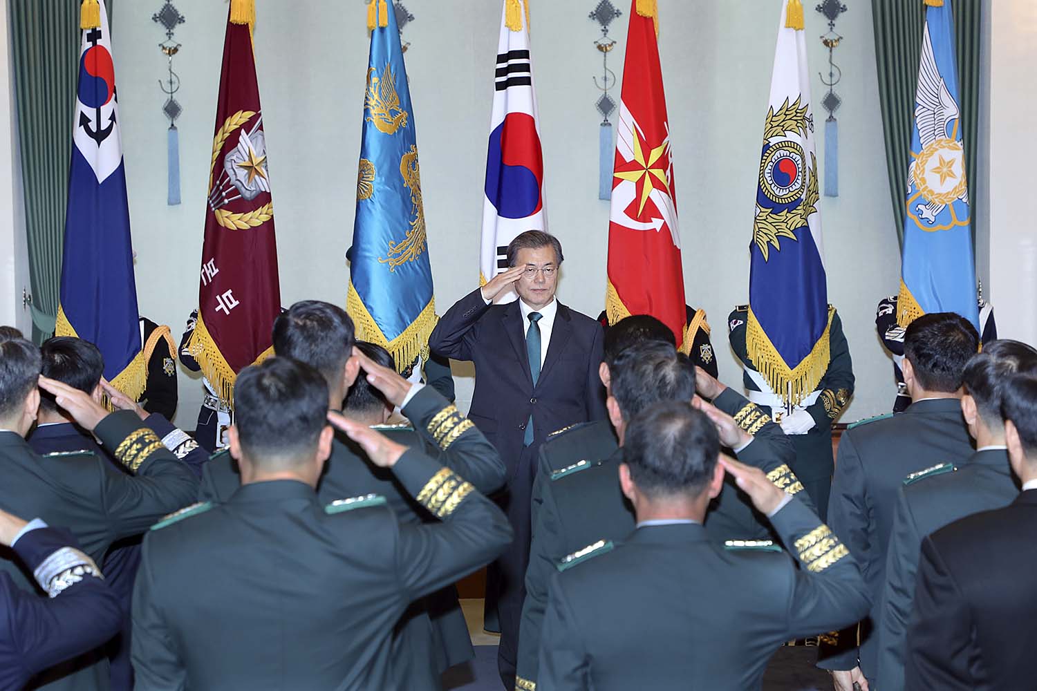 문재인 대통령이 27일 오후 청와대 본관 충무실에서 군 장성 진급 및 보직신고를 받고 있다.
