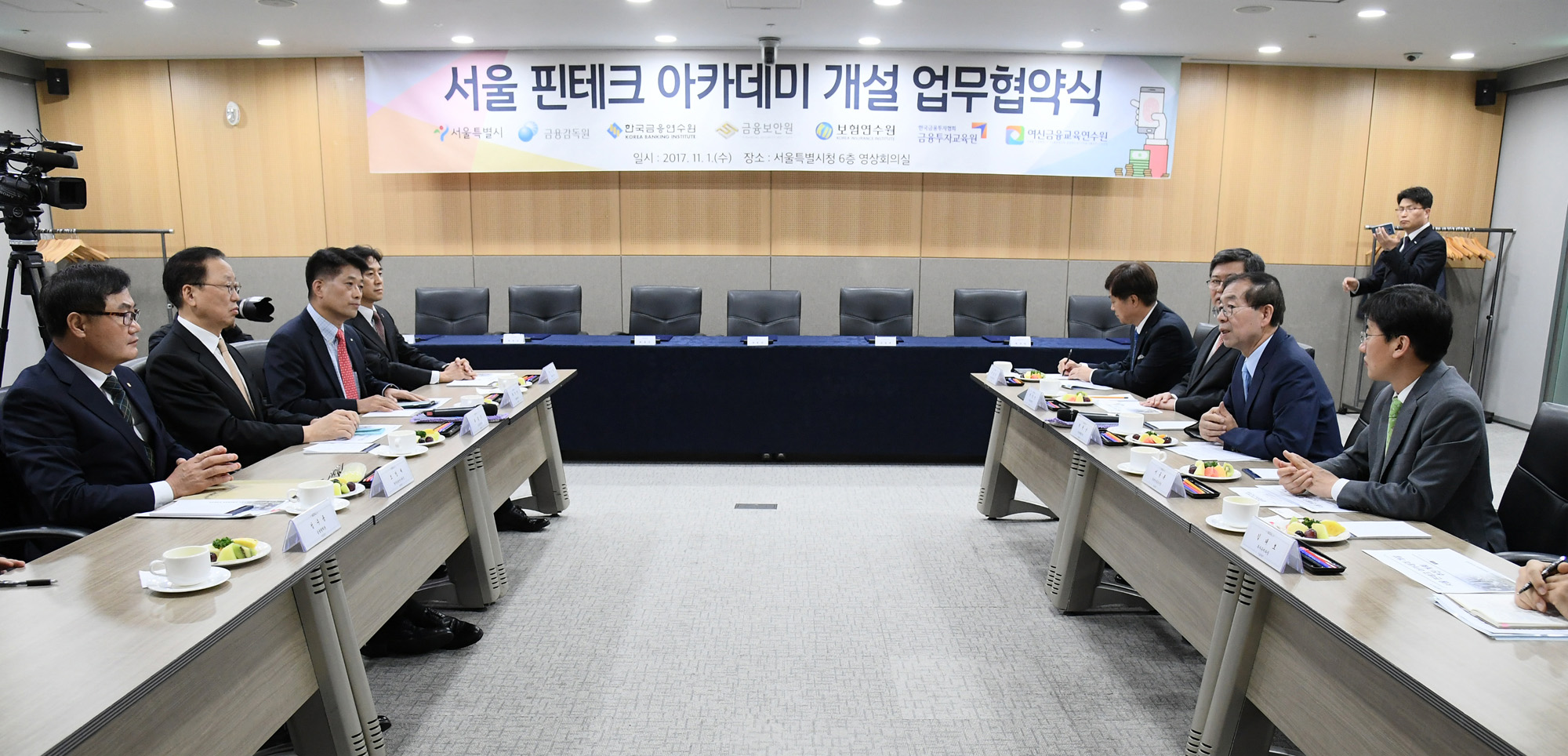 박원순 서울시장이 1일 서울시청 본관에서 6개 금융기관 관계자들과 서울 핀테크 아카데미 개설 업무협약을 맺고 있다. 서울시 제공