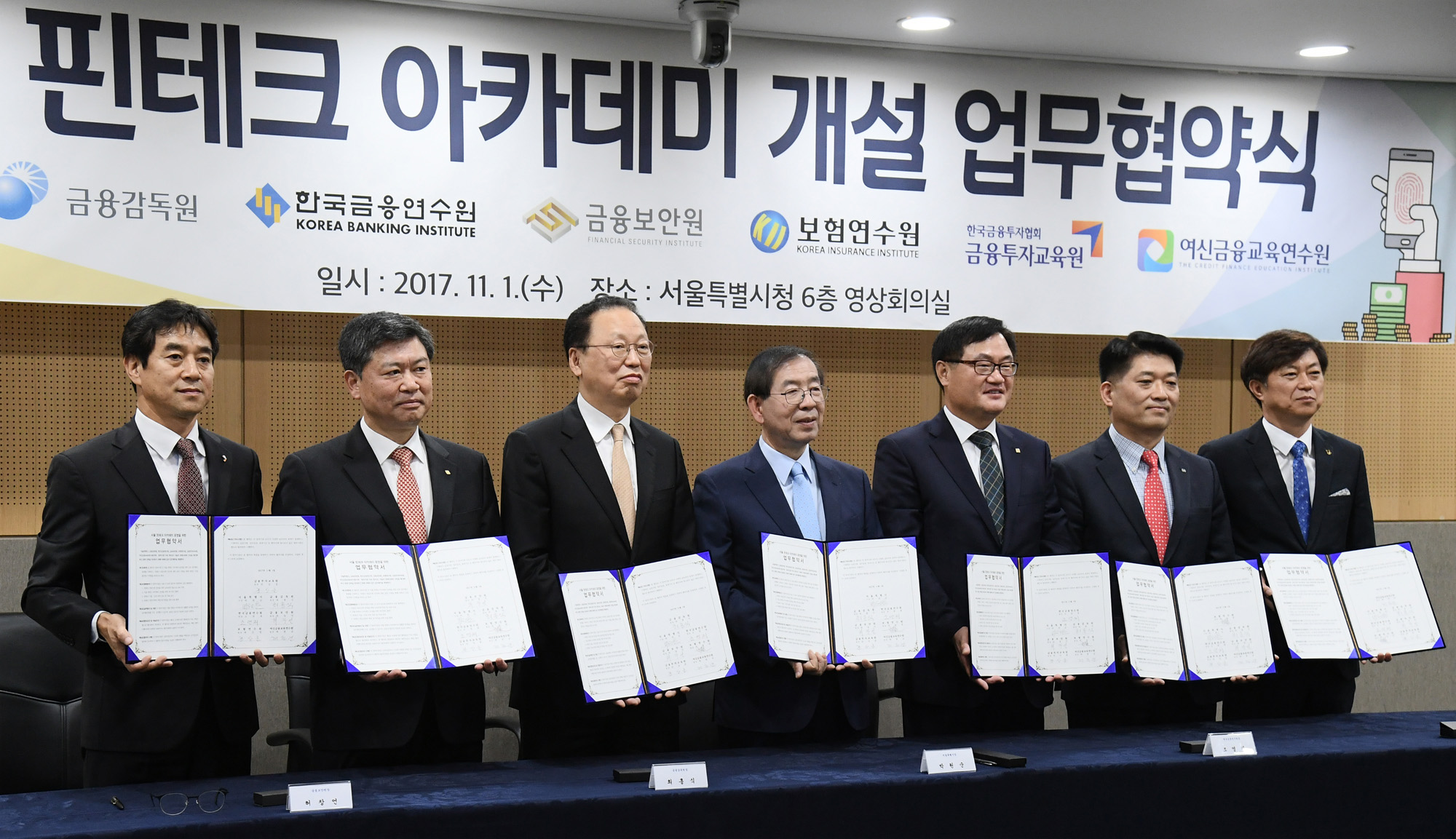 박원순 서울시장이 1일 서울시청 본관에서 6개 금융기관 관계자들과 서울 핀테크 아카데미 개설 업무협약을 맺고 있다. 서울시 제공