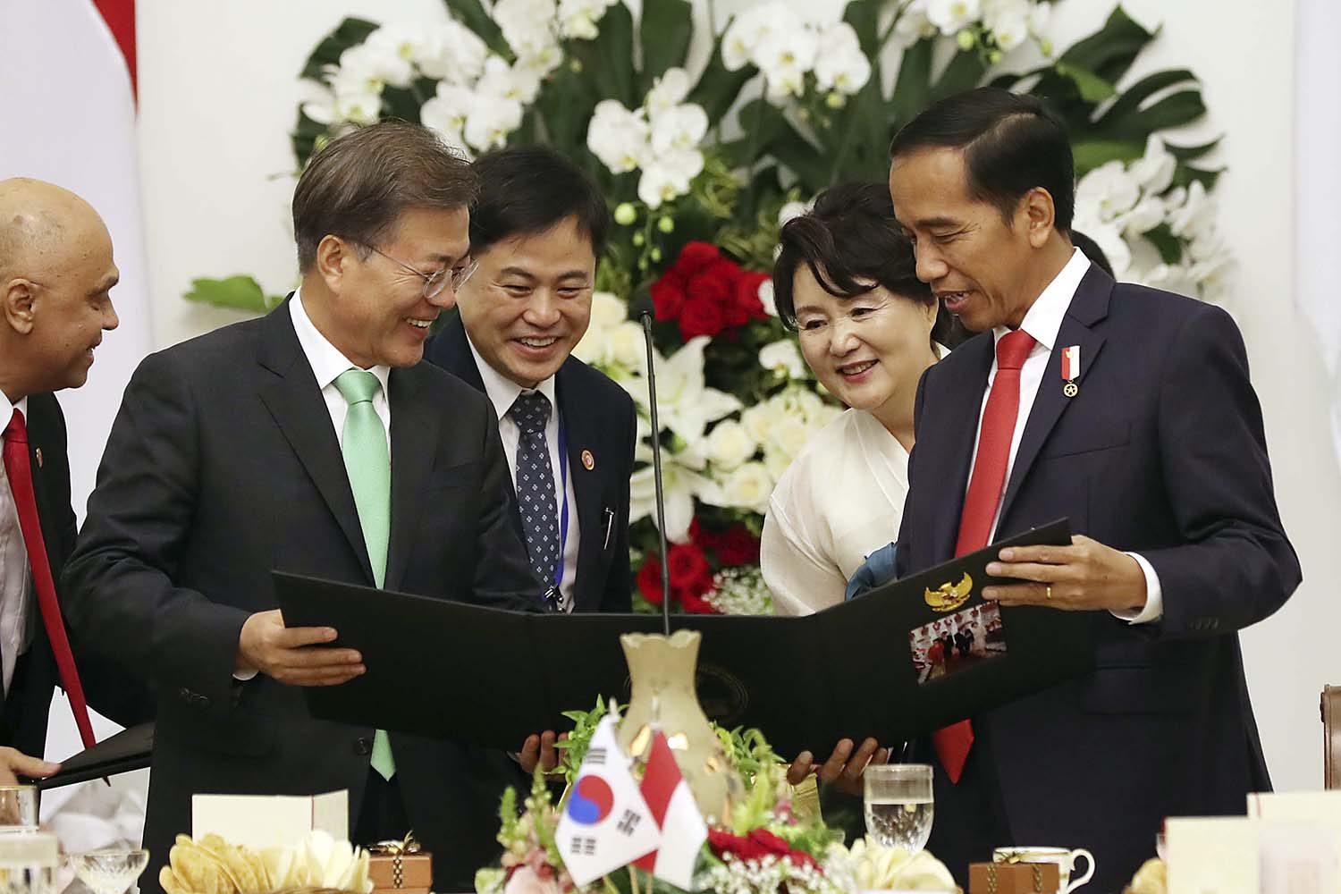 문재인 대통령이 9일 오후 보고르 대통령궁 가루다홀에서 열린 조코 위도도 인도네시아 대통령 주최 국빈만찬에서 두 정상 내외가 함께 한 모습이 담긴 사진첩을 선물 받고 있다. 2017.11.09