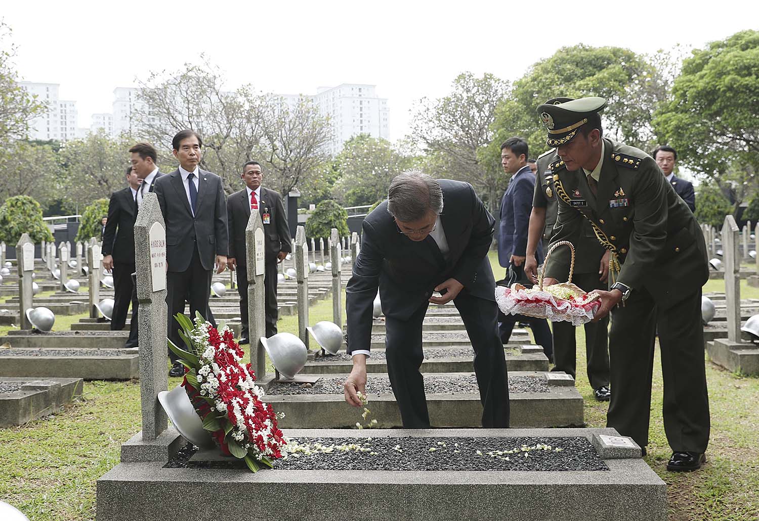 인도네시아를 국빈 방문중인 문재인 대통령이 9일 오전(현지시간) 자카르타 칼리바타 영웅묘지내에 있는 인도네시아 국가 영웅 아구스 살림의 묘를 찾아 헌화하고 있다.