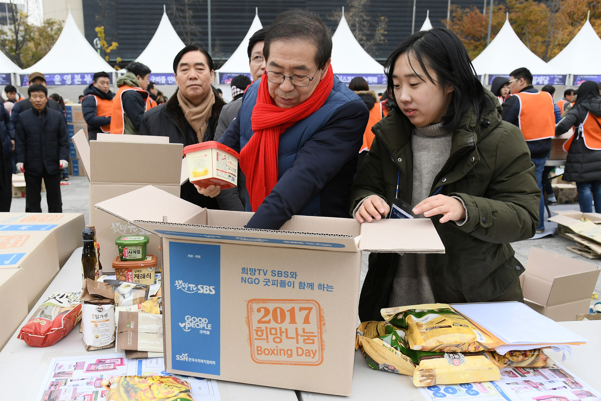 박원순 서울시장이 17일 오후 서울 세종대로 광화문광장에서 열린 '2017 희망나눔 박싱데이'에 참가해 희망나눔 상자를 만들고 있다. 서울시 제공