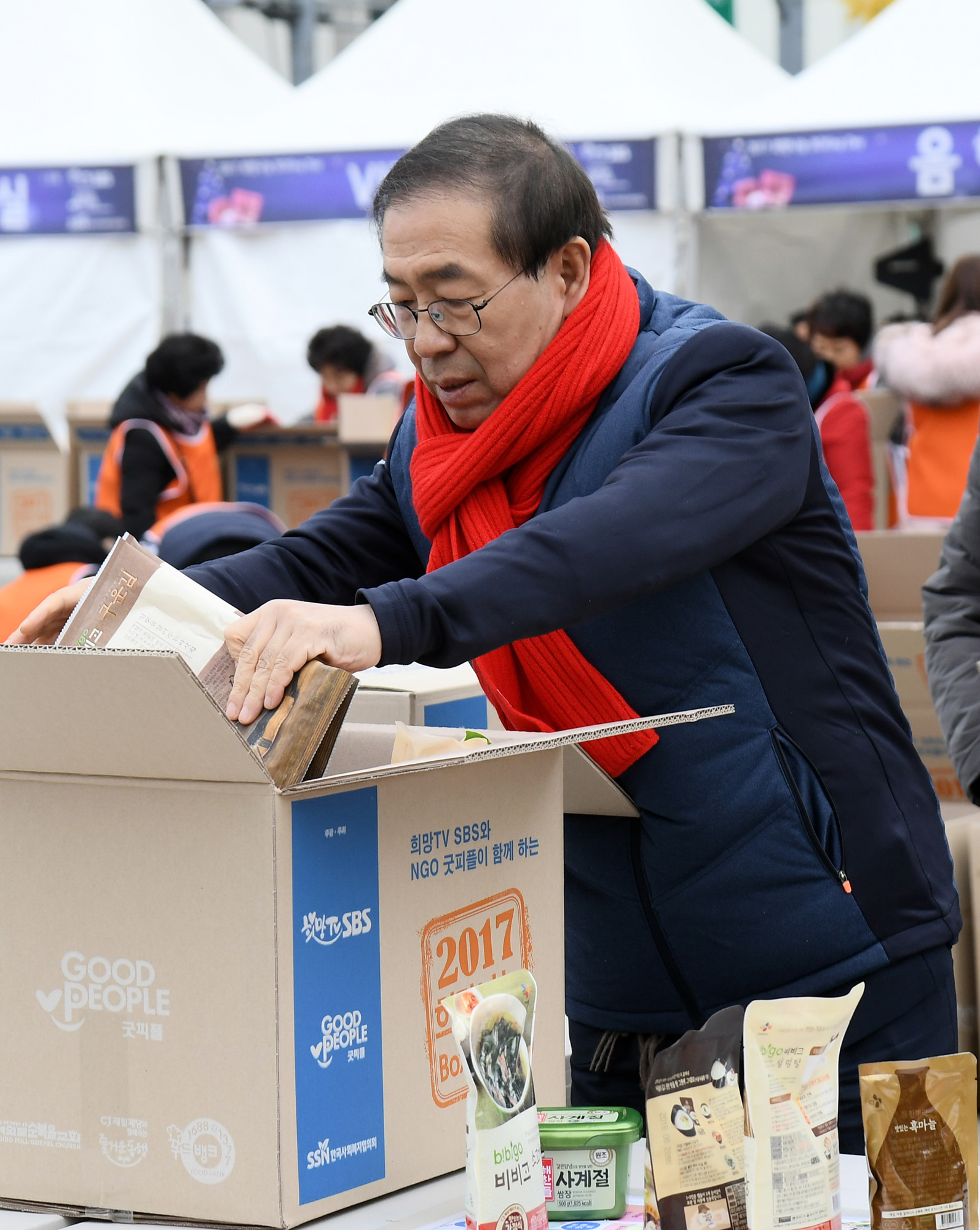 박원순 서울시장이 17일 오후 서울 세종대로 광화문광장에서 열린 '2017 희망나눔 박싱데이'에 참가해 희망나눔 상자를 만들고 있다. 서울시 제공