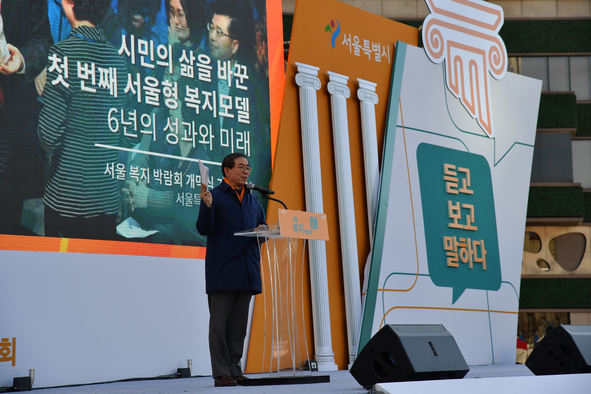 박원순 서울시장이 18일 서울광장에서 열리는 ‘서울복지 박람회-듣고 보고 말하다’에서 민선5?6기 서울복지정책 성과와 앞으로의 복지비전을 발표하고 있다. 서울시 제공