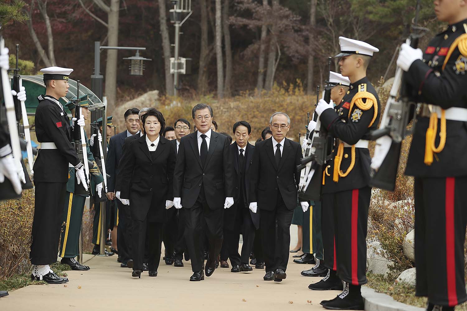 문재인 대통령과 부인 김정숙 여사가 22일 오후 서울 동작동 국립서울현충원에서 열린 고 김영삼 전 대통령 서거 2주기 추도식에 참석하기 앞서 묘소를 참배하고 있다. 2917.11.22