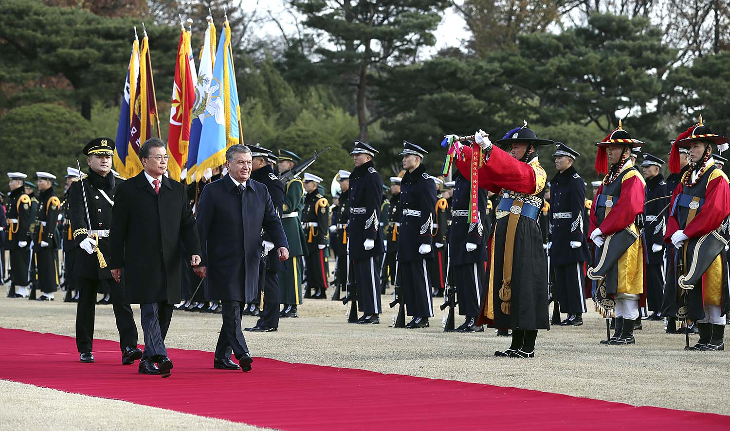 문재인 대통령과 미르지요예프 우즈베키스탄 대통령이 23일 오후 청와대 대정원에서 열린 공식환영식에서 의장대를 사열하고 있다. 2017.11.23