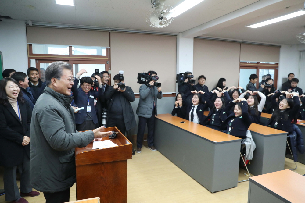 문재인 대통령이 24일 오전 지진으로 인해 특별재난지역으로 지정된 경북 포항시 북구의 포항여고를 방문해 현장을 점검하고 있다.