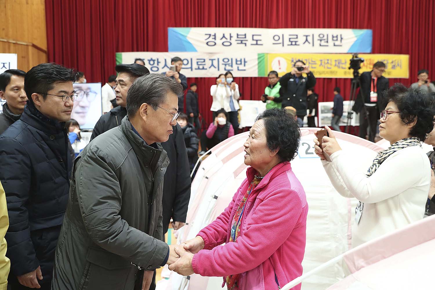 포항 지진피해 현장점검에 나선 문재인 대통령이 24일 흥해 실내체육관을 방문해 대피소를 살펴보고 있다.