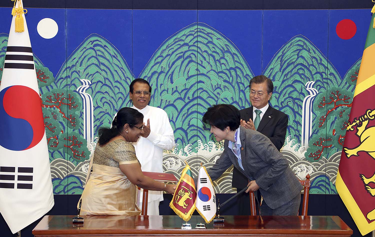 문재인 대통령과 마이트리팔라 시리세나 스리랑카 대통령이 29일 오전 청와대에서 한-스리랑카 문화협력 협정 서명식을 지켜보고 있다.