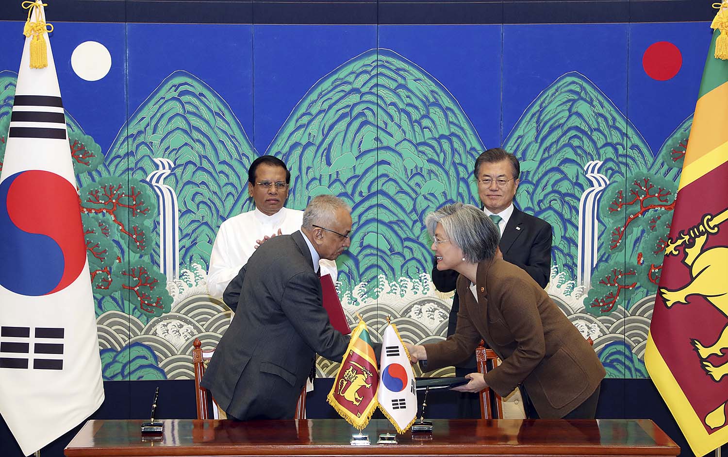 문재인 대통령과 마이트리팔라 시리세나 스리랑카 대통령이 29일 오전 청와대에서 한-스리랑카 문화협력 협정 서명식을 지켜보고 있다.