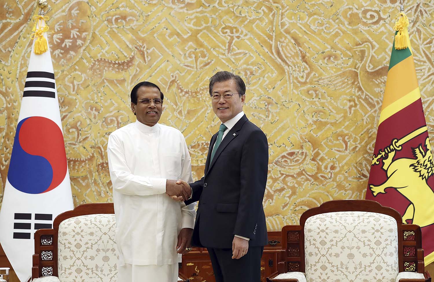 문재인 대통령이 29일 청와대에서 국빈 방한한 마이트리팔라 시리세나 스리랑카 대통령과 단독 정상회담에 앞서 악수하고 있다.