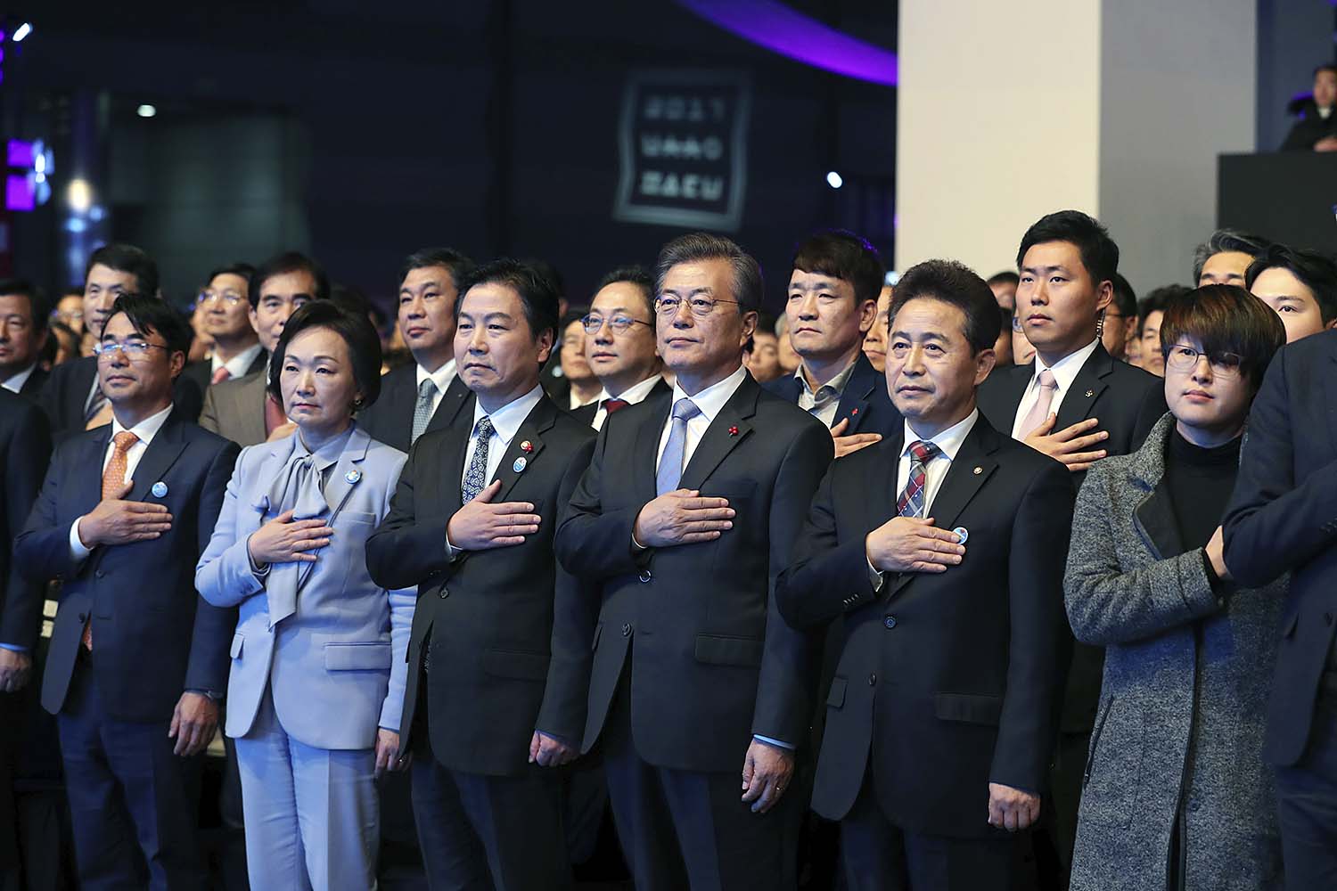 중소기업벤처부 출범식에서 국민의례하는 문재인 대통령 30일 오후 서울 삼성동 코엑스에서 열린 중소벤처기업부 출범식에 문재인 대통령이 참석해 국민의례를 하고 있다.. 2017.11.30