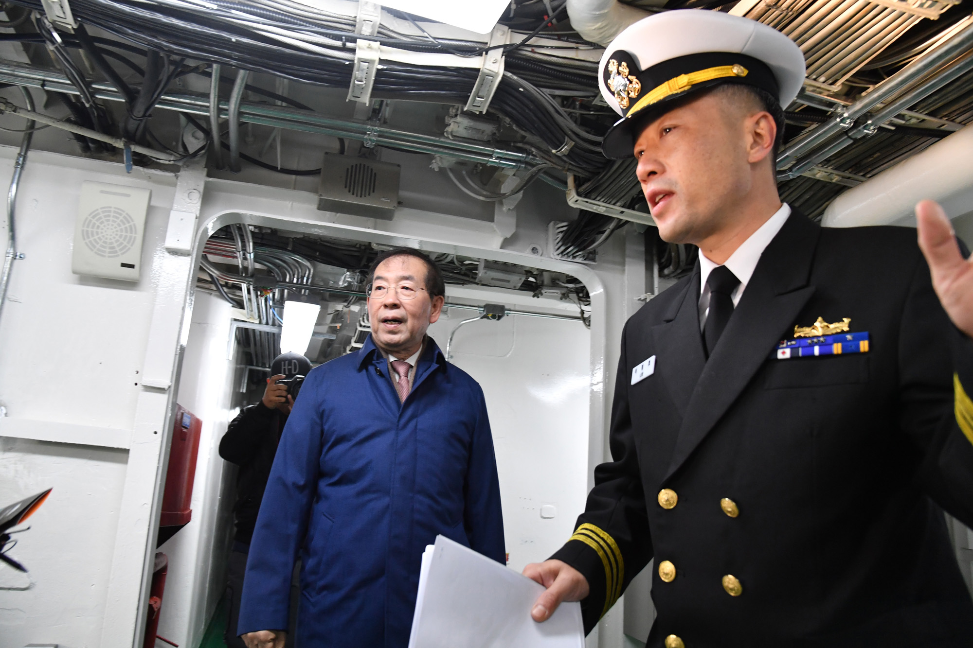 박원순 서울시장이 22일 서울 마포구 망원한강공원에서 서울함 공원 개장을 알리는 버튼을 누르고 있다. 서울시 제공
