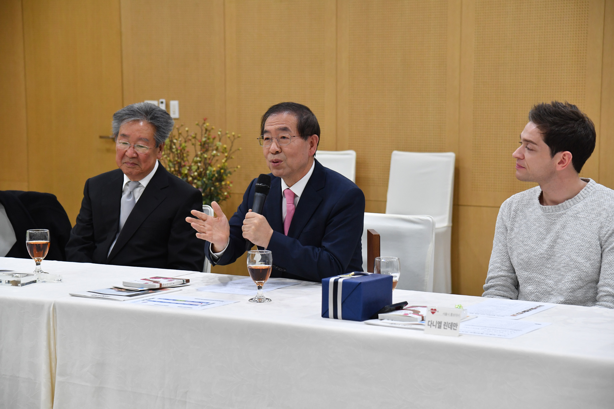 | 사진설명 | 23일 오후 서울시청에서 열린 2017 서울시 홍보대사 위촉식에 기타리스트 신대철(왼쪽부터), 의학전문가 홍혜걸, 여에스더, 개그맨 정찬우, 배우 한예리, 박원순 서울시장, 배우 최불암, 개그맨 장도연, 요리연구가 최현석, 방송인 다니엘 린데만, 개그맨 김태균이 기념촬영을 하고 있다. 서울시 제공 |