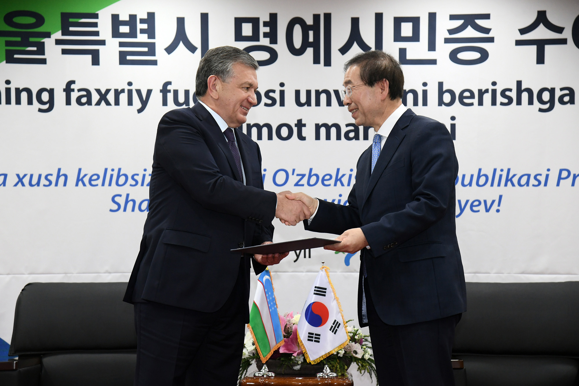미르지요예프 우즈베키스탄 대통령이 24일 오후 서울시청사를 방문해 박원순 시장이 명예시민증을 수여하고 있다. 서울시 제공