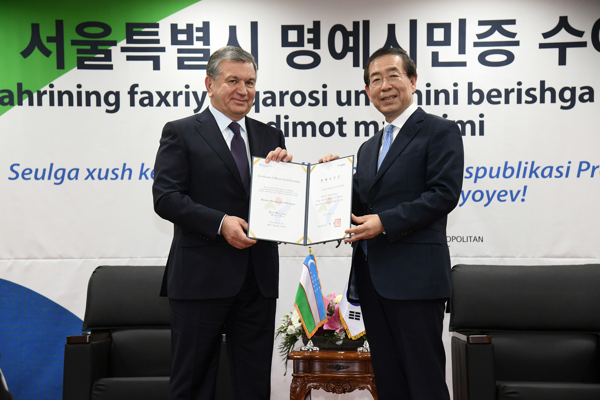 미르지요예프 우즈베키스탄 대통령이 24일 오후 서울시청사를 방문해 박원순 시장이 명예시민증을 수여하고 있다. 서울시 제공