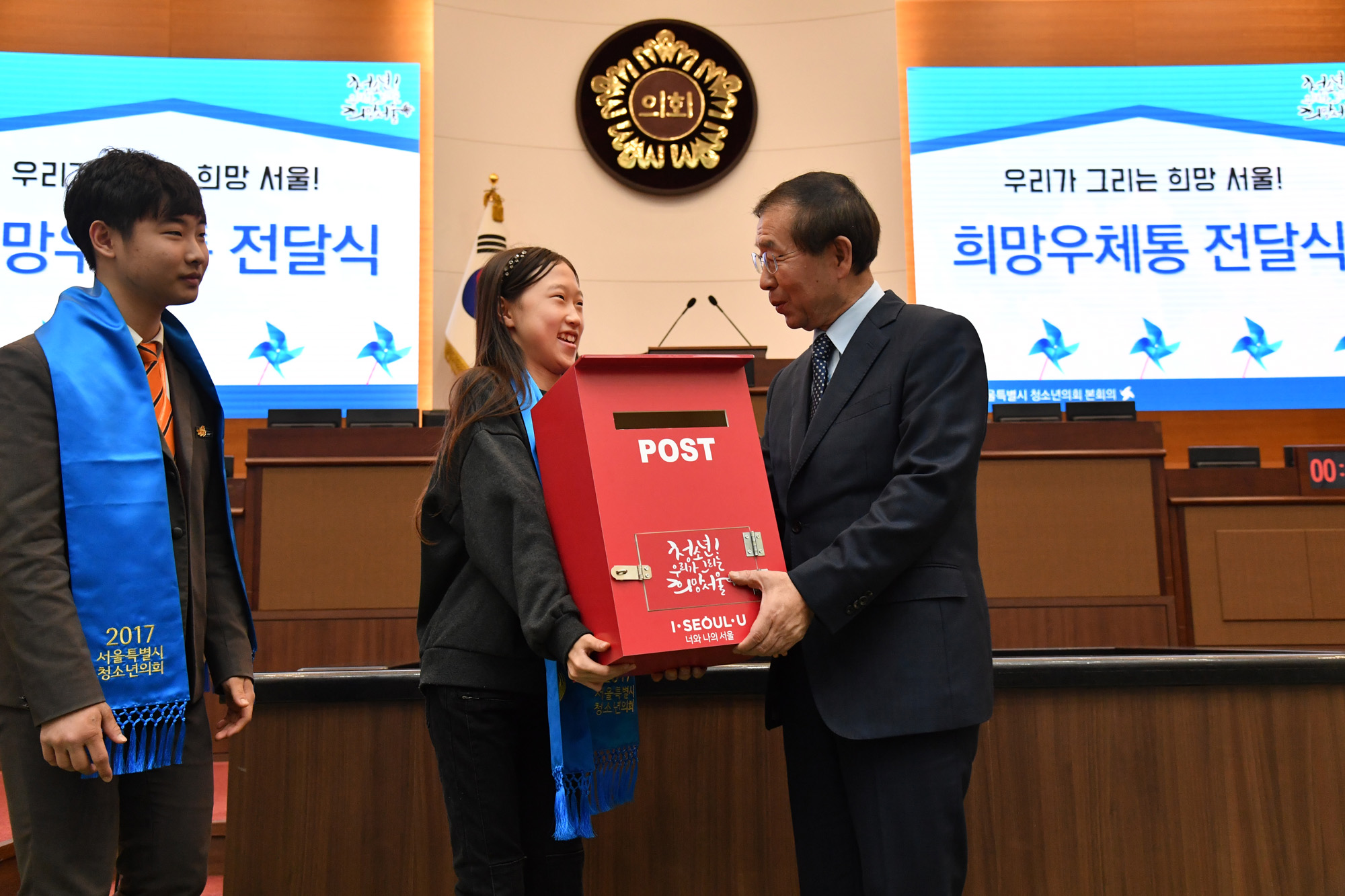 박원순 서울시장이 25일 오후 서울 중구 서울시의회에서 열린 '2017 서울특별시 청소년의회 본회의'에서 참석해 격려사를 하고 있다. 서울시 제공