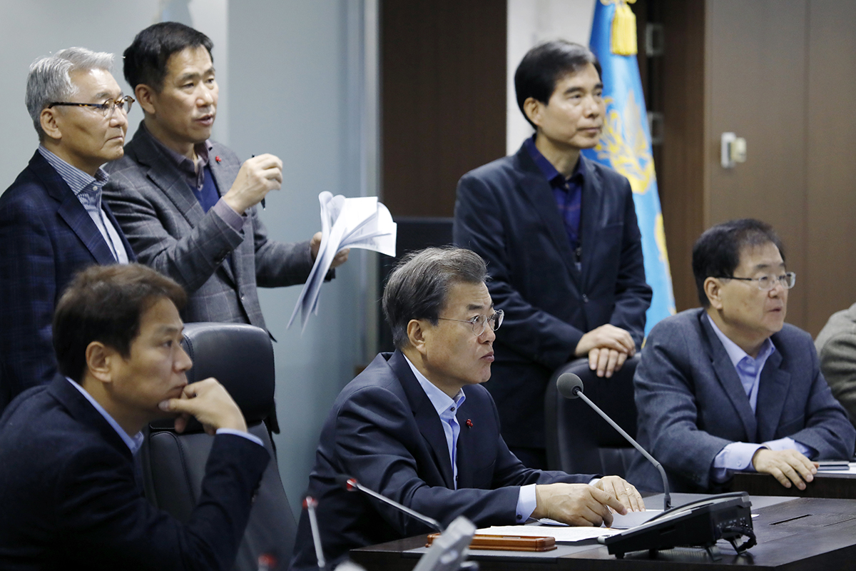 문재인 대통령이 3일 오전 인천 영흥도 낚싯배 전복 관련해 청와대 국가위기관리센터에서 지시사항을 내리고 있다.