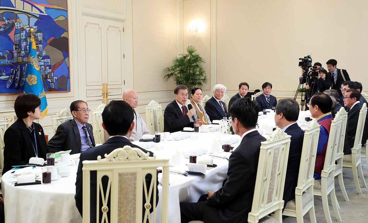 문재인 대통령이 6일 오후 청와대 본관 인왕실에서 종교지도자 초청 오찬 간담회에 참석하고 있다 .이날 간담회에는 천주교 김희중 대주고, 조계종 총무원장 설정 스님, 한기총 대표회장 엄기호 목사, 원불교 한은숙 교정원장, 천도교 이정희 교령, 박우균 민족종교협의회장, 김영근 성균관장, 한국종교인평화회의 김영주 목사가 참석했다. 2017.12.6 사진/청와대제공 |