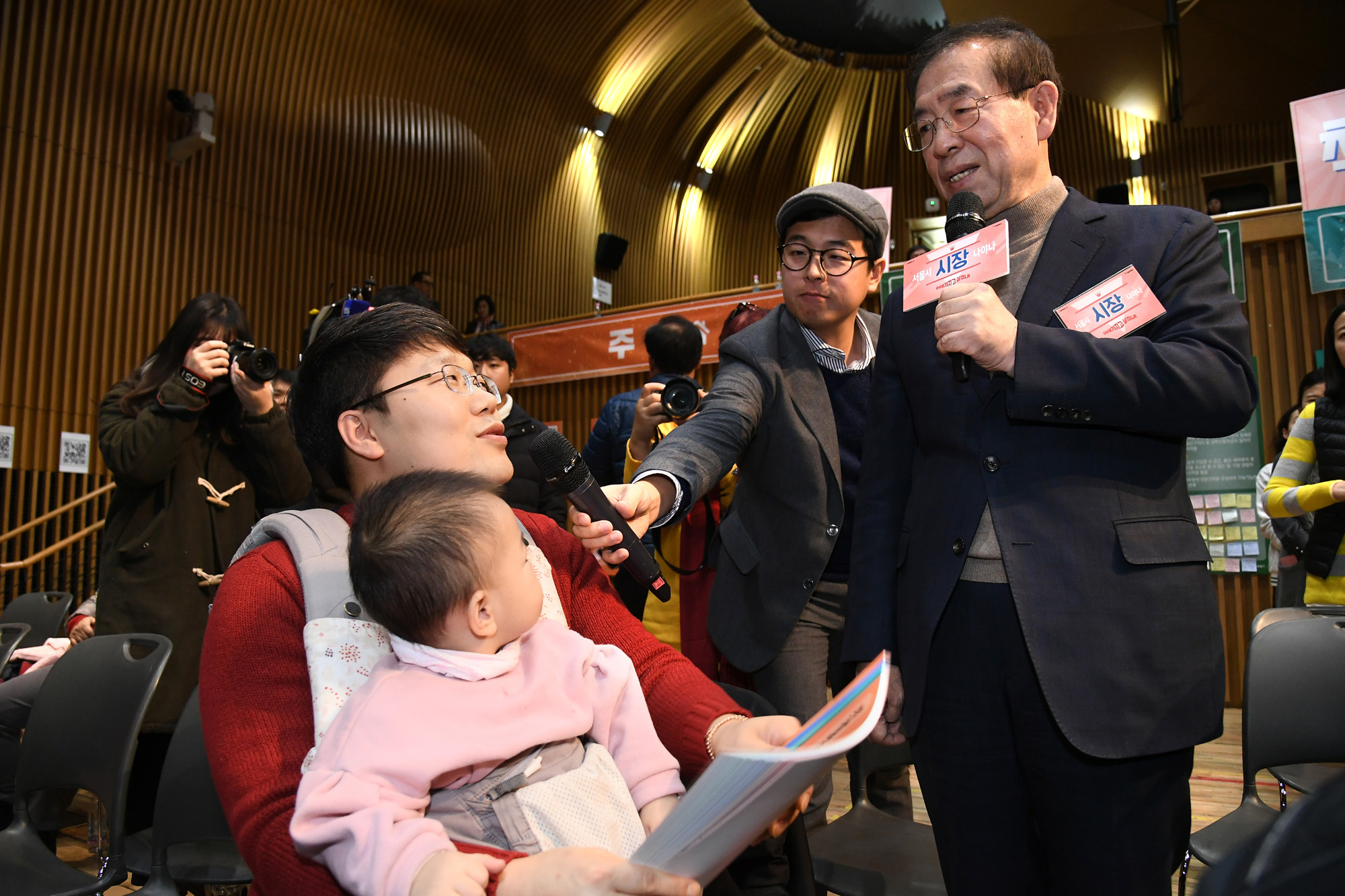 박원순 서울시장이 9일 시청에서 열린 저출산 대책 토론회에서 시민과 대화하고 있다. 서울시 제공