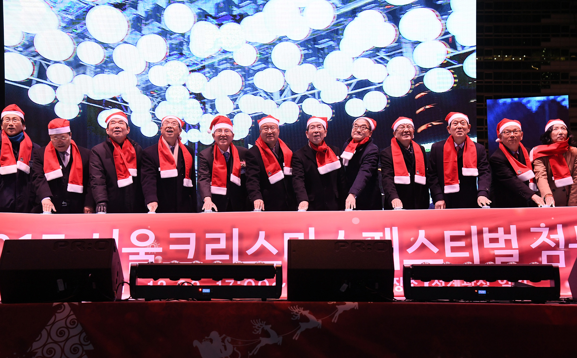 9일 밤 서울 중구 청계천로 청계광장에서 열린 '2017 서울크리스마스페스티벌' 점등식에서 박원순 서울시장 등이 점등 버튼을 누르고 있다. 서울시 제공