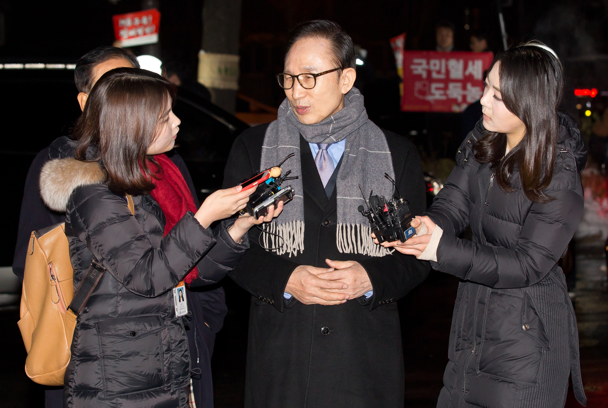 [서울=eoimage] (이오이미지) 임준선기자 =이명박 전 대통령이 18일 오후 서울 신사동 한 식당에서 열린 친이명박계 인사들과 송년회를 위해 들어서며 취재진의 질문에 답하고 있다. 2017.12.18
