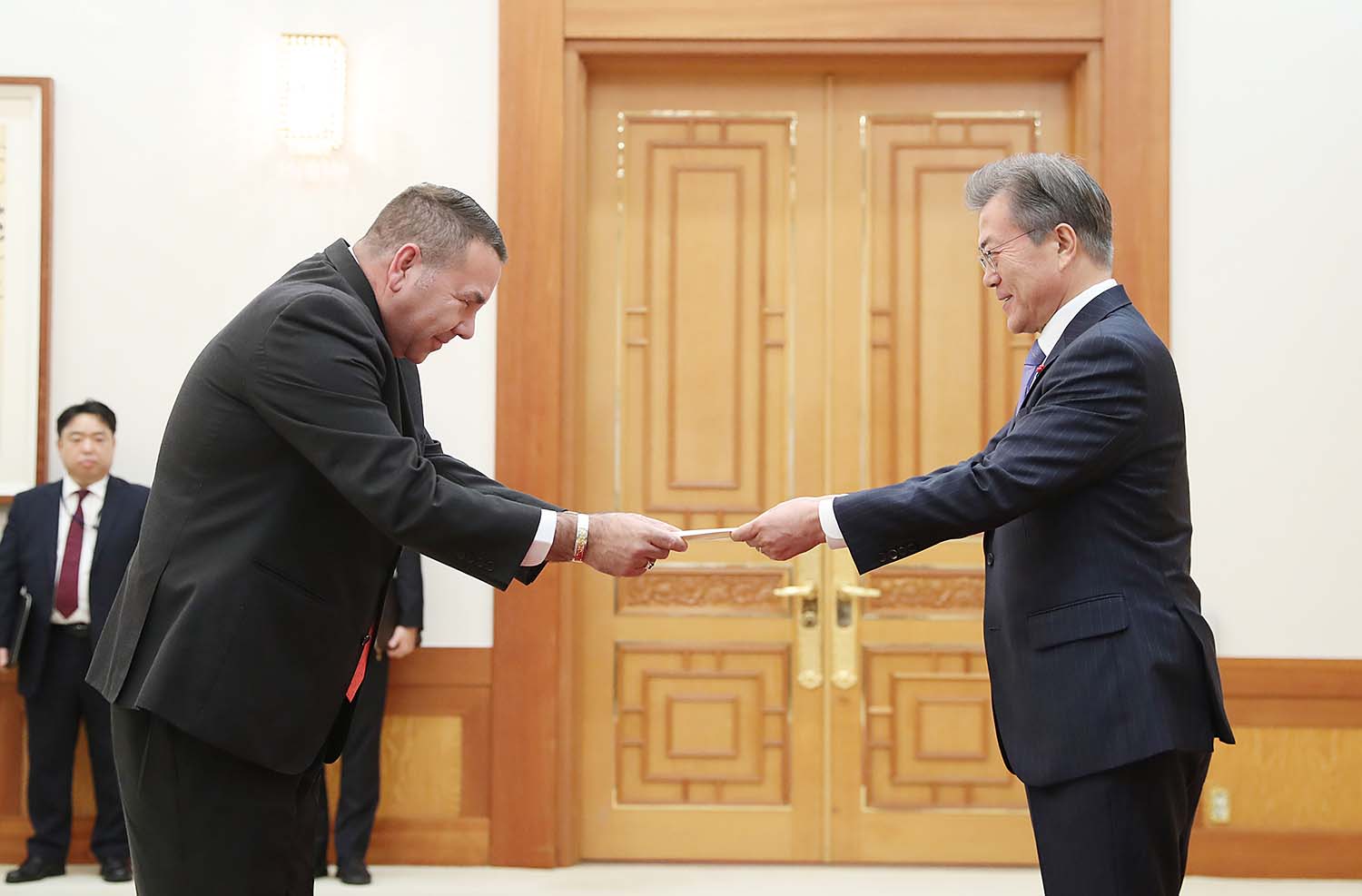20일 오후 문재인 대통령이 청와대 본관 접견실에서 비르힐리오 빠레데스 뜨라뻬로 주한 온두라스 대사의 신임장을 받고 있다.