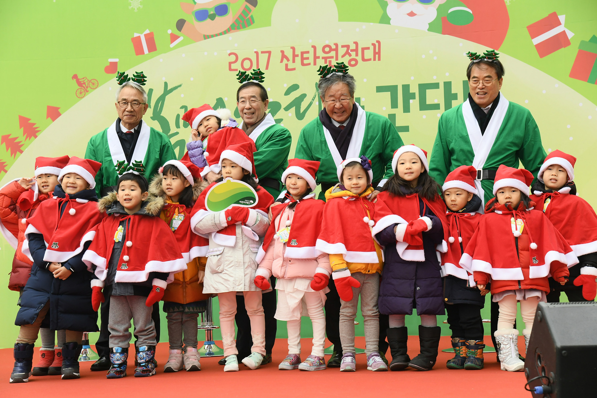 산타복장을 한 박원순 서울시장이 15일 서울 중구 프레스센터 앞마당에서 열린 다동·무교동과 함께하는 산타원정대 선포식에서 배우 최불암과 함께 원정대 선포를 하고 있다. 서울시 제공