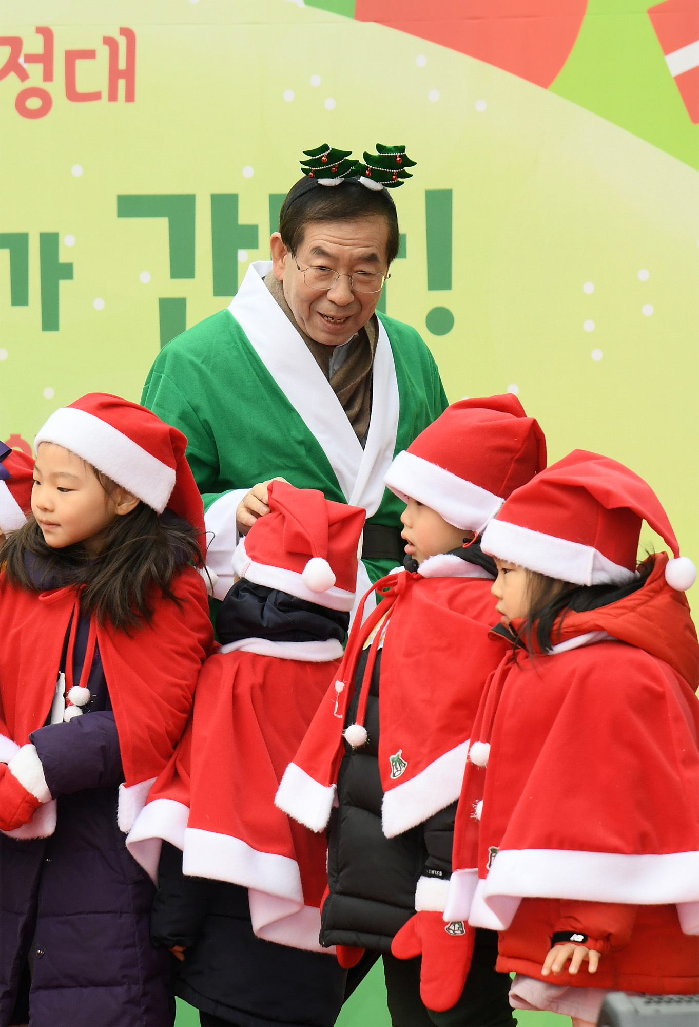 산타복장을 한 박원순 서울시장이 15일 서울 중구 프레스센터 앞마당에서 열린 다동·무교동과 함께하는 산타원정대 선포식에서 배우 최불암과 함께 원정대 선포를 하고 있다. 서울시 제공