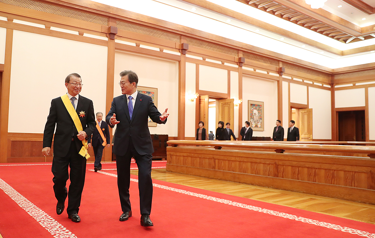 문재인 대통령이 27일 청와대 본관 접견실에서 양승태 전 대법원장 에게 국민훈장 무궁화장을 수여한 후 환담을 위해 이동하고 있다