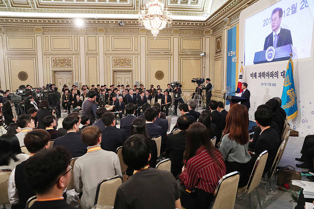 문재인 대통령이 28일 청와대 영빈관에서 열린 '도전하는 내일, 사람을 향한 꿈' 미래 과학자와의 대화에 참석하고 있다.