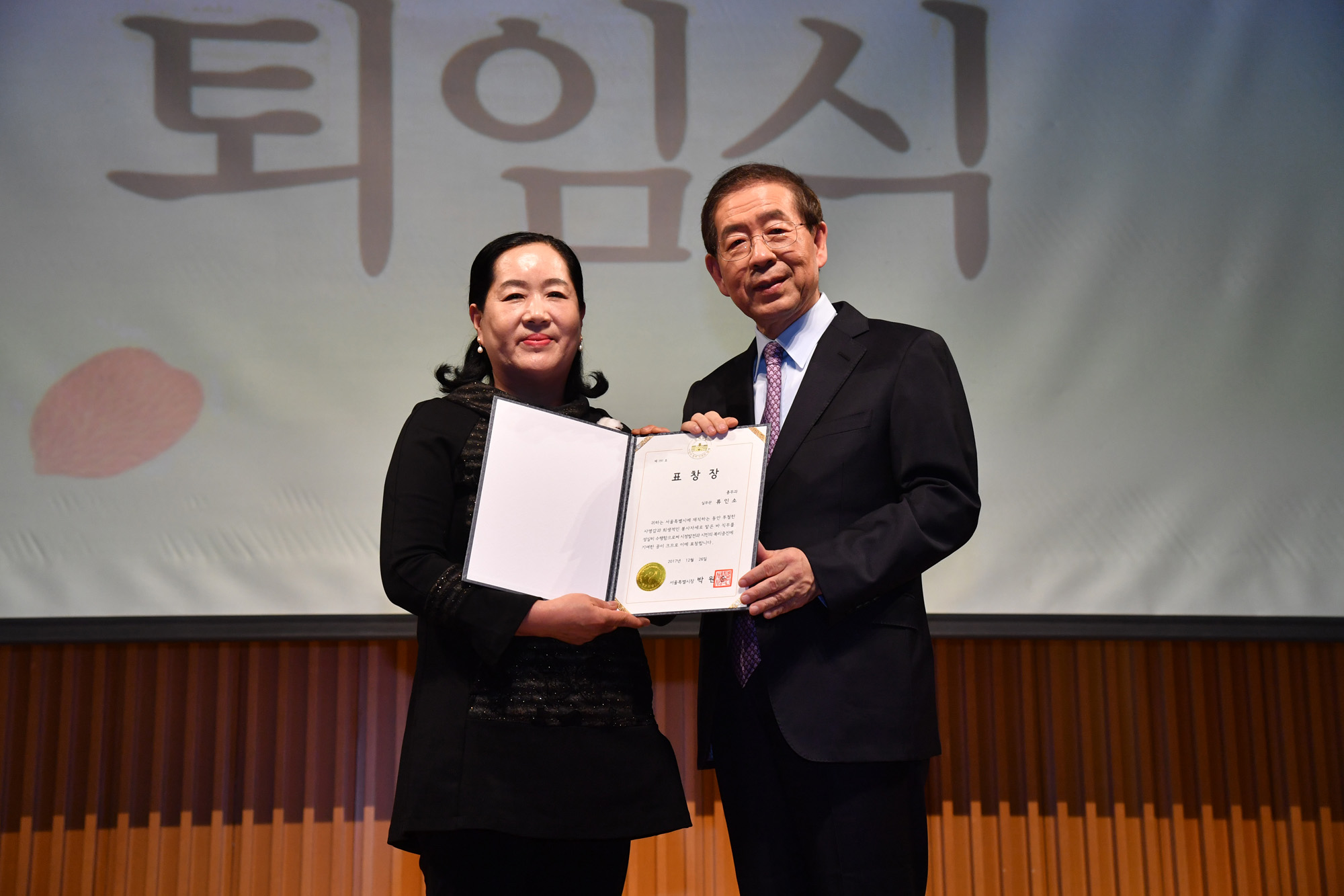 박원순 서울시장이 26일 오후 2시 시청 본관 다목적홀에서 '2017년 공무직 퇴임식'을 열고 110명의 정년 퇴임자들에게 감사와 격려 인사를 하고 표창하고 있다. 서울시 제공