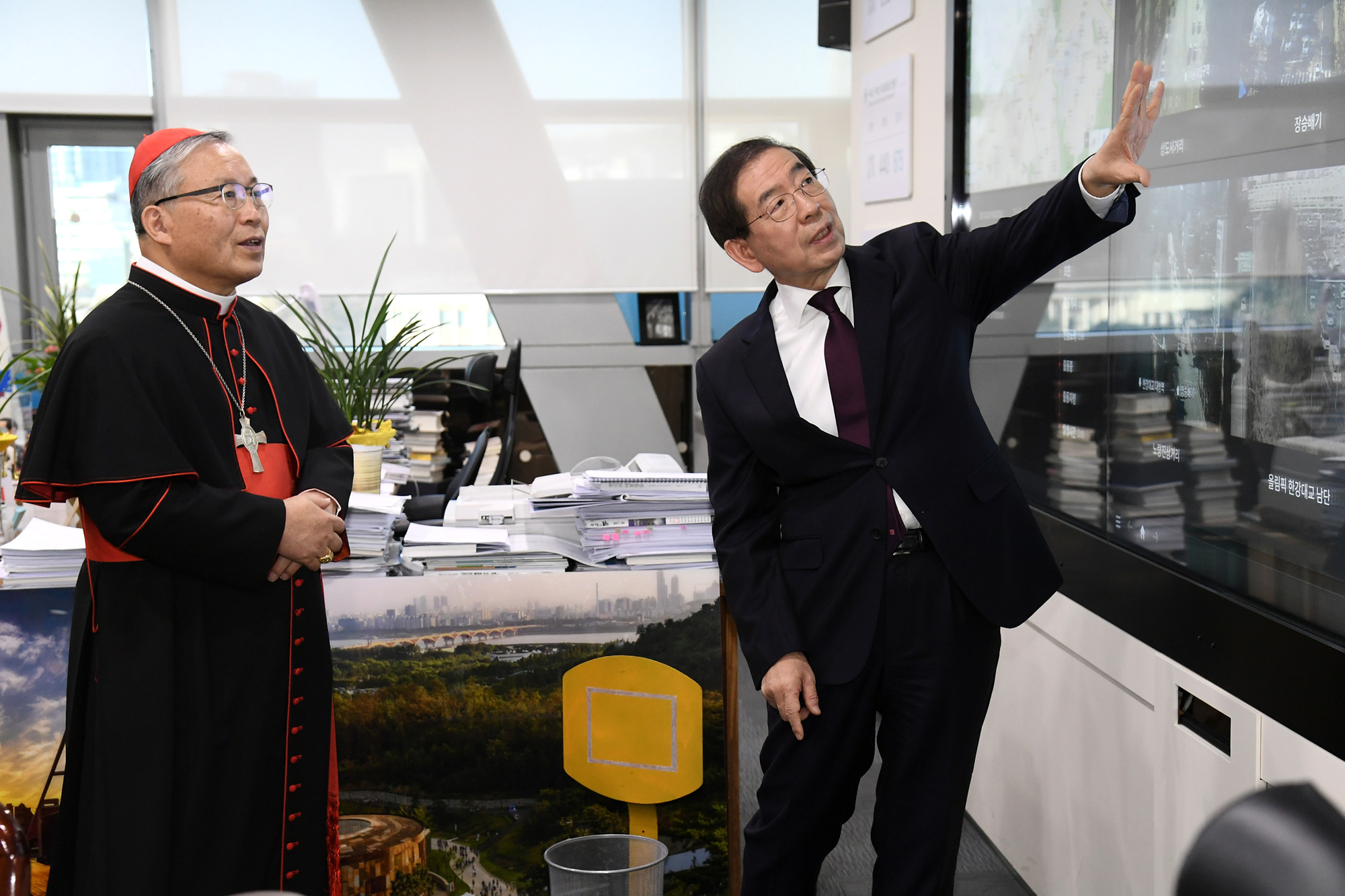 박원순 서울시장과 천주교 서울대교구장인 염수정 추기경은 27일 오전 서울시청에서 '태양광 발전 확대를 위한 업무협약'을 체결했다. 서울시 제공