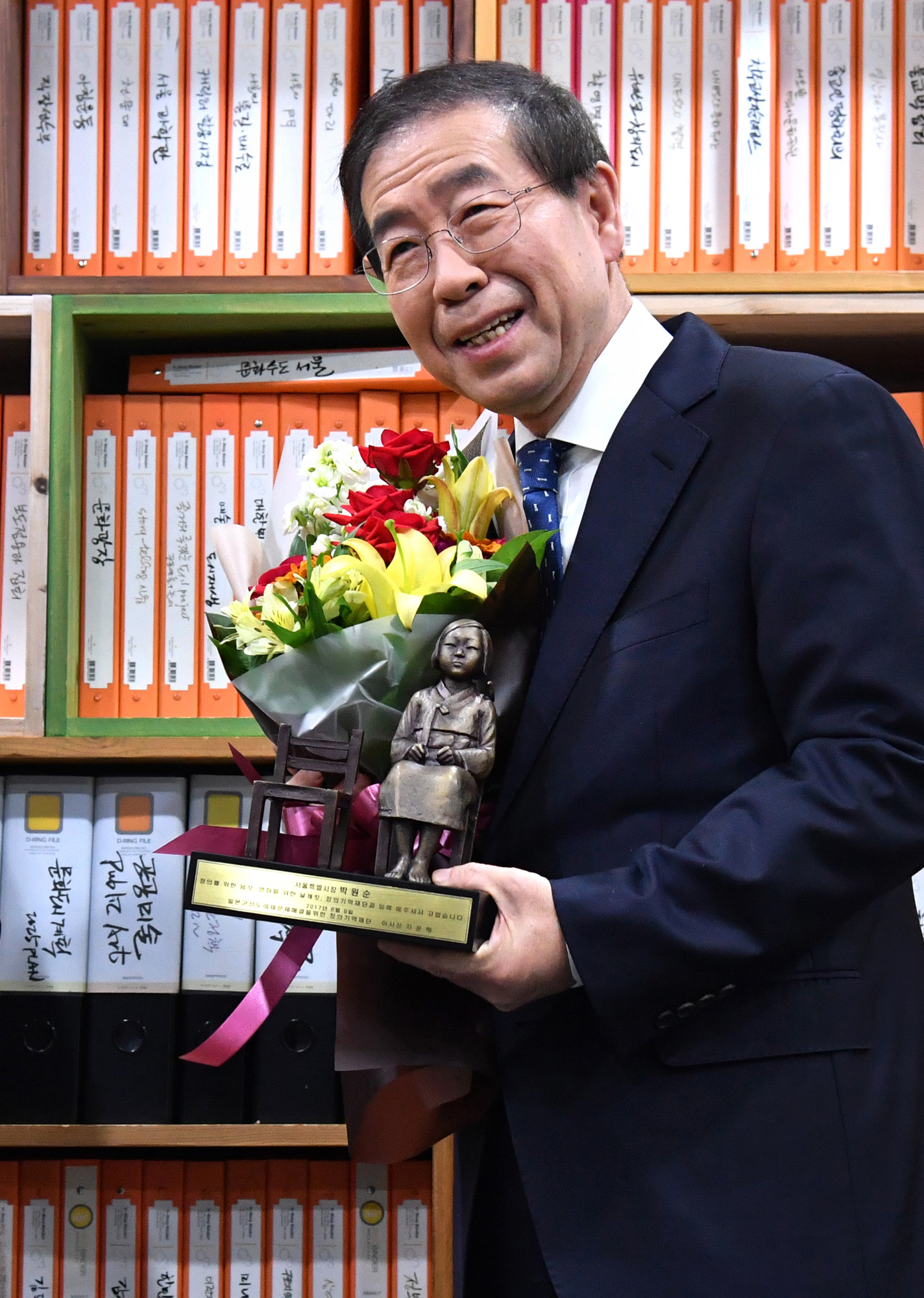 박원순 시장이 28일 오전 서울시청 시장실에서 '일본군 성노예제 문제해결을 위한 정의기억재단'으로부터 감사패를 받은 뒤 윤미향 정의기억재단 상임이사 등과 대화를 나누고 있다. 서울시 제공