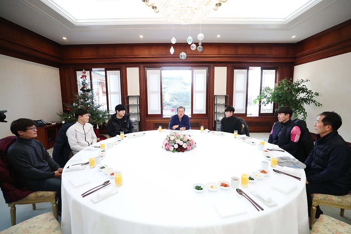 문재인 대통령이 1일 북한산에서 2018년 새해맞이를 마치고 산행에 동행한 2017년을 빛낸 의인 6명을 청와대 관저 초청해 조찬으로 떡국을 함께 하고 있다
