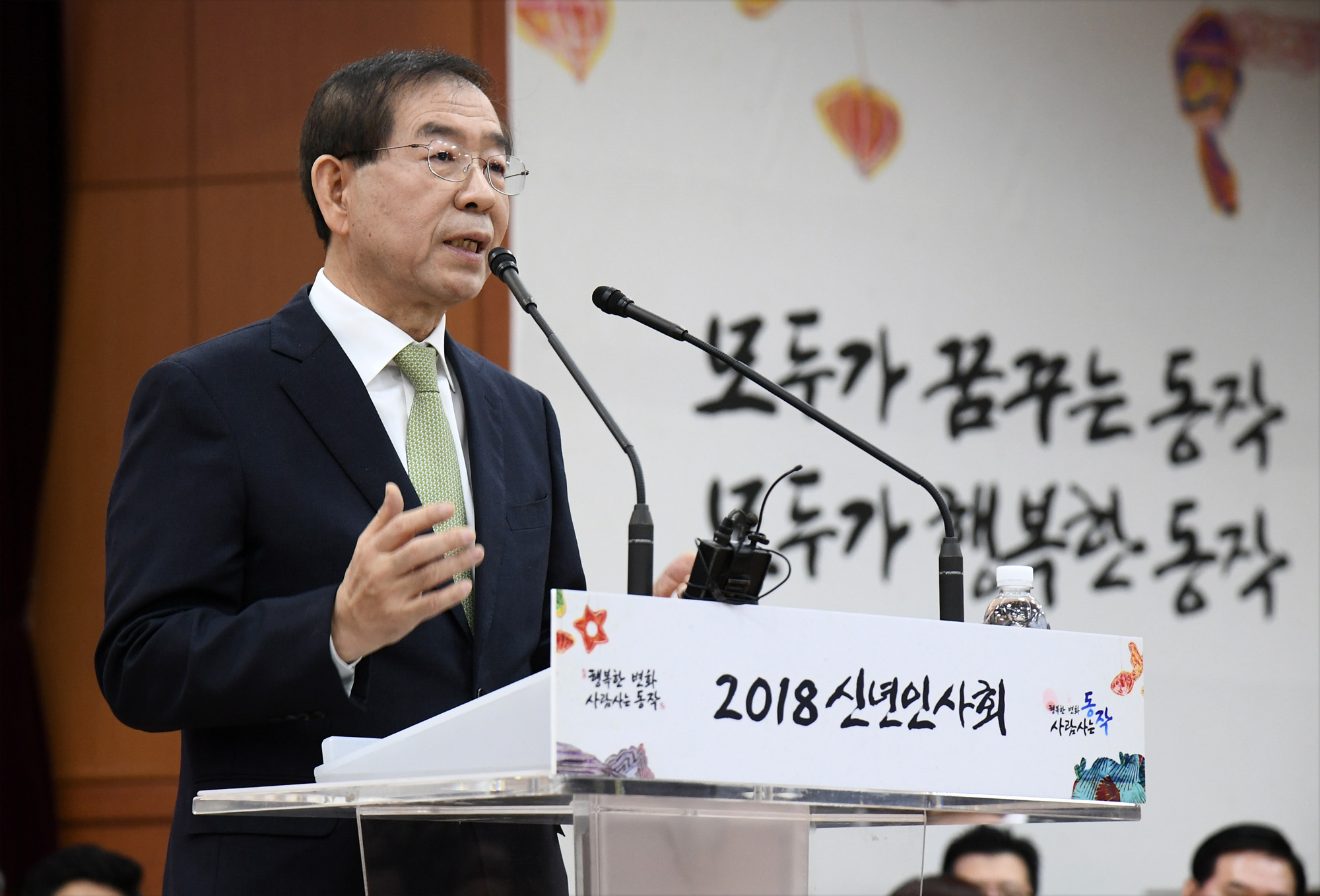 박원순 서울시장이 5일 서울 동작구청에서 열린 '2018년 동작구 신년인사회'에 참석해 인사말을 하고 있다. 서울시 제공