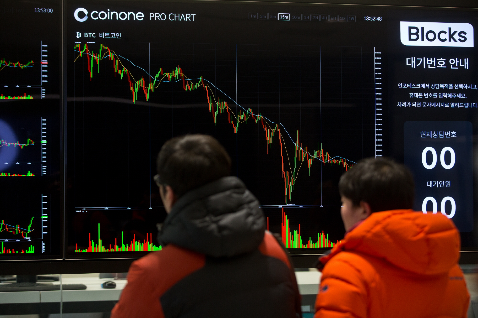 | 사진설명 | [서울=eoimage] 고성준 기자 = 법무부가 가상화폐 거래소 폐쇄 방침을 밝힌지 하루 지난 12일 오후 서울 영등포구에 위치한 가상화폐 거래소 '코인원블록스'를 찾은 시민들이 가상화폐 시세 전광판을 주시하고 있다. 법무부의 가상화폐 거래소 폐쇄 방침을 두고 한편에서는 찬성과 우려의 목소리가 대립하고 있다. 2018.1.12 |