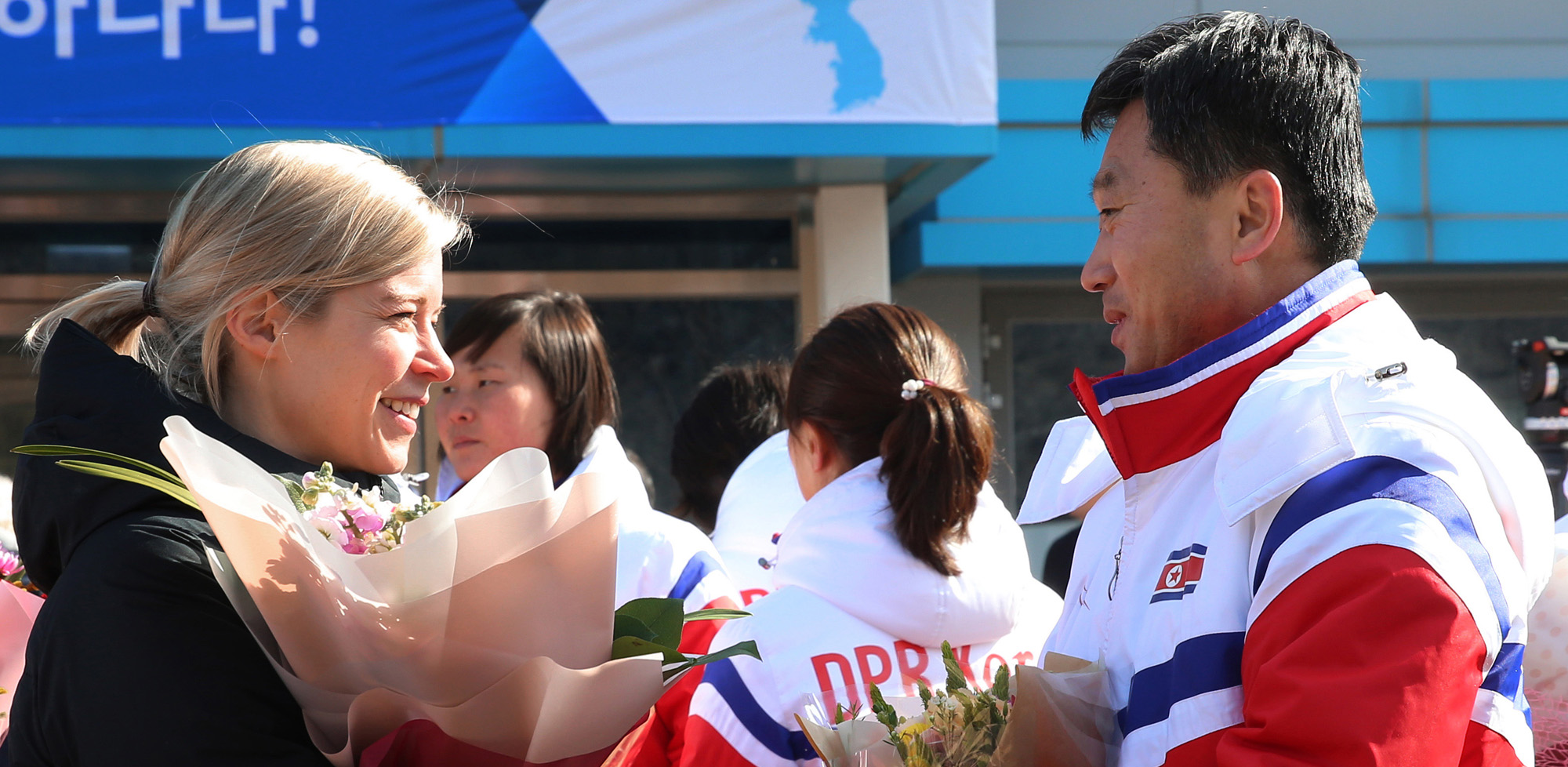 우리나라와 단일팀을 구성해 평창동계올림픽에 출전할 북한 여자 아이스하키 선수단이 25일 오후 충청북도 진천군 국가대표선수촌 빙상훈련장에 도착한 가운데 세라머리 남북단일팀 총감독과 박철호북한여자 아이스하키팀 감독이 인사하고 있다. 2018.01.25 사진공동취재단