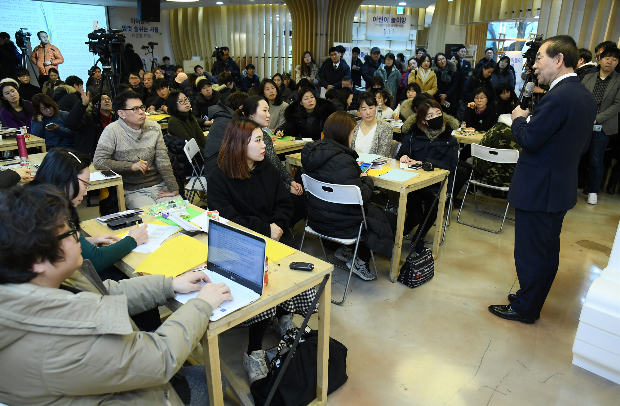 박원순 서울시장이 23일 오전 서울 중구 서울시NPO지원센터 대강당에서 열린 '아이들이 맘껏 숨 쉬는 서울 타운홀 미팅'에 참석해 영·유아 학부모들과 대화하고 있다. 서울시 제공