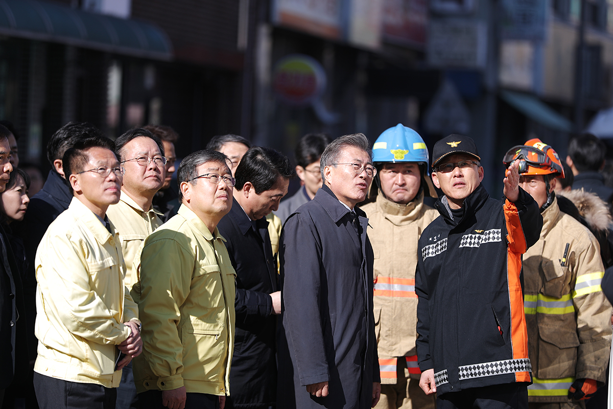 문재인 대통령이 27일 경남 밀양 세종병원 화재 참사 현장을 직접 방문해 희생자와 유가족들에게 깊은 애도와 위로의 뜻을 전하고, 소방관을 비롯한 현장수습 요원들을 격려했다