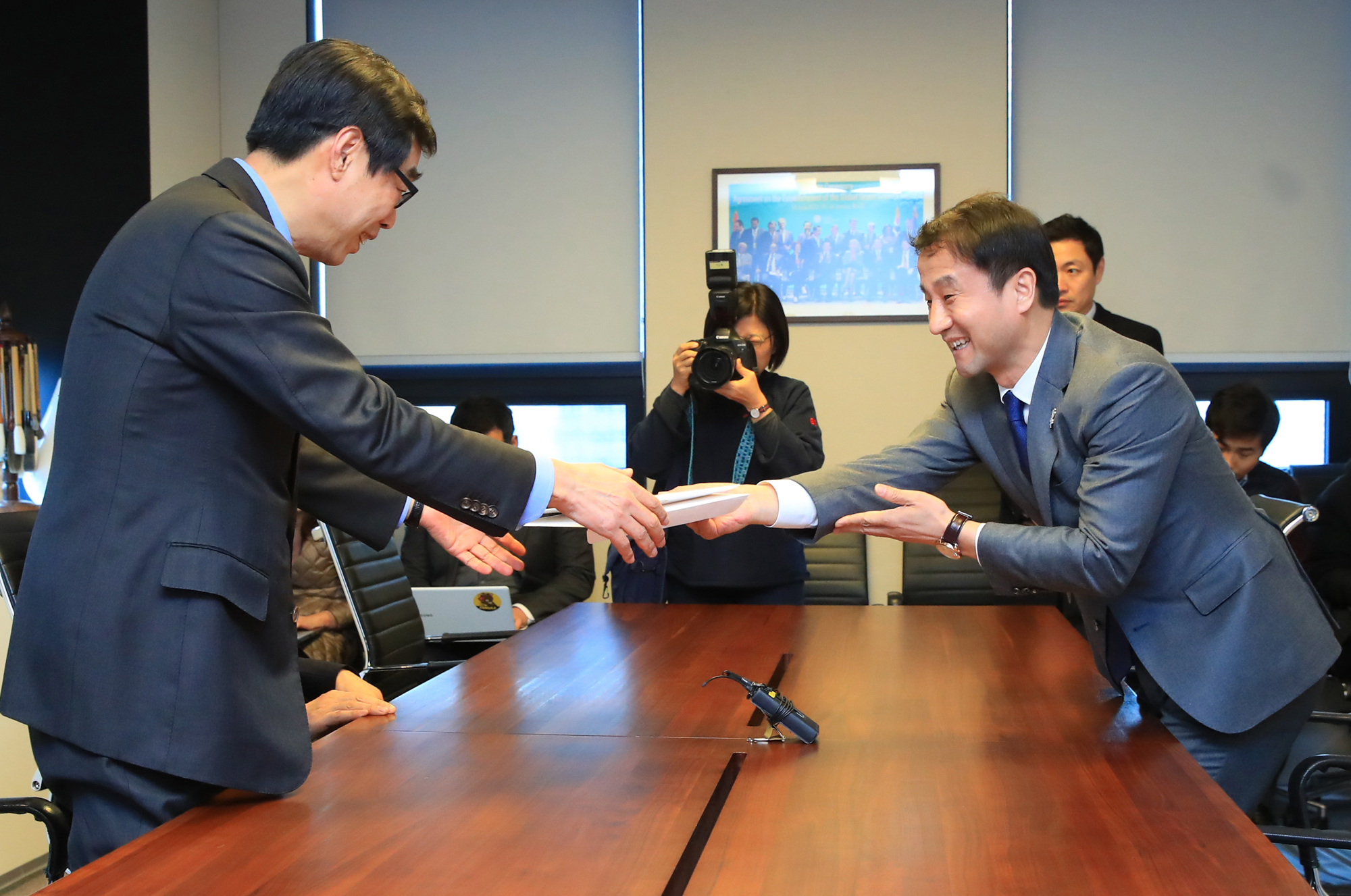 한병도 청와대 정무수석(오른쪽)이 31일 오후 서울 강남구 이명박 전 대통령의 사무실을 찾아 장다사로 부속실장에게 평창 동계올림픽 초청장을 전달하고 있다. 2018.01.31 사진/임준선 (현장풀)