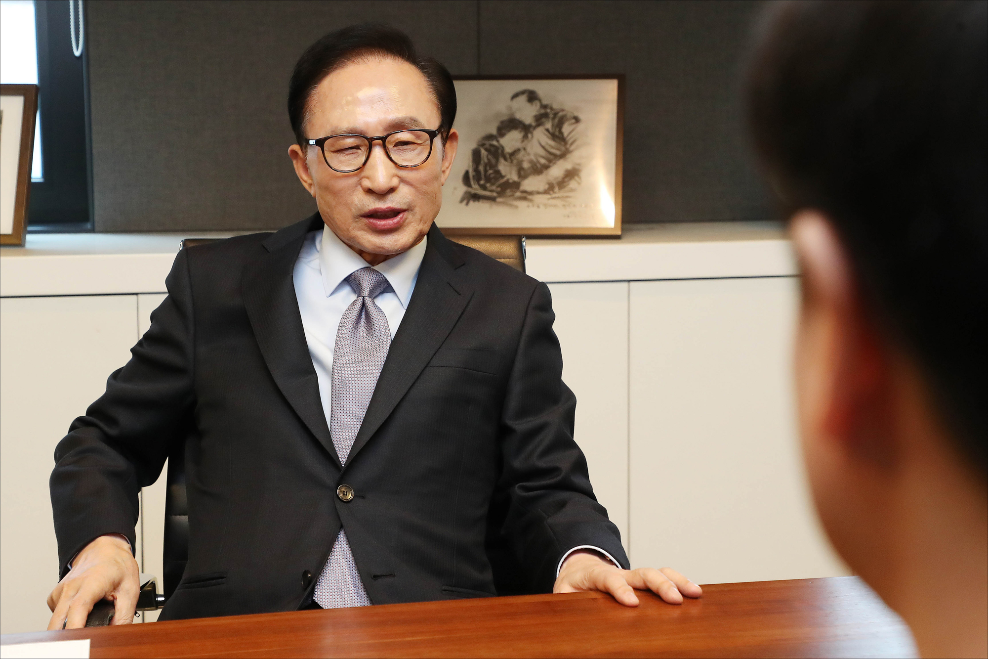 이명박(MB) 전 대통령이 31일 오후 서울 강남구에 위치한 이 전 대통령의 사무실에서 한병도 청와대 정무수석으로부터 2018 평창 동계올림픽 개·폐막식 초청장을 전달 받은 뒤 대화를 나누고 있다.2018.01.31 사진/임준선 (현장풀)