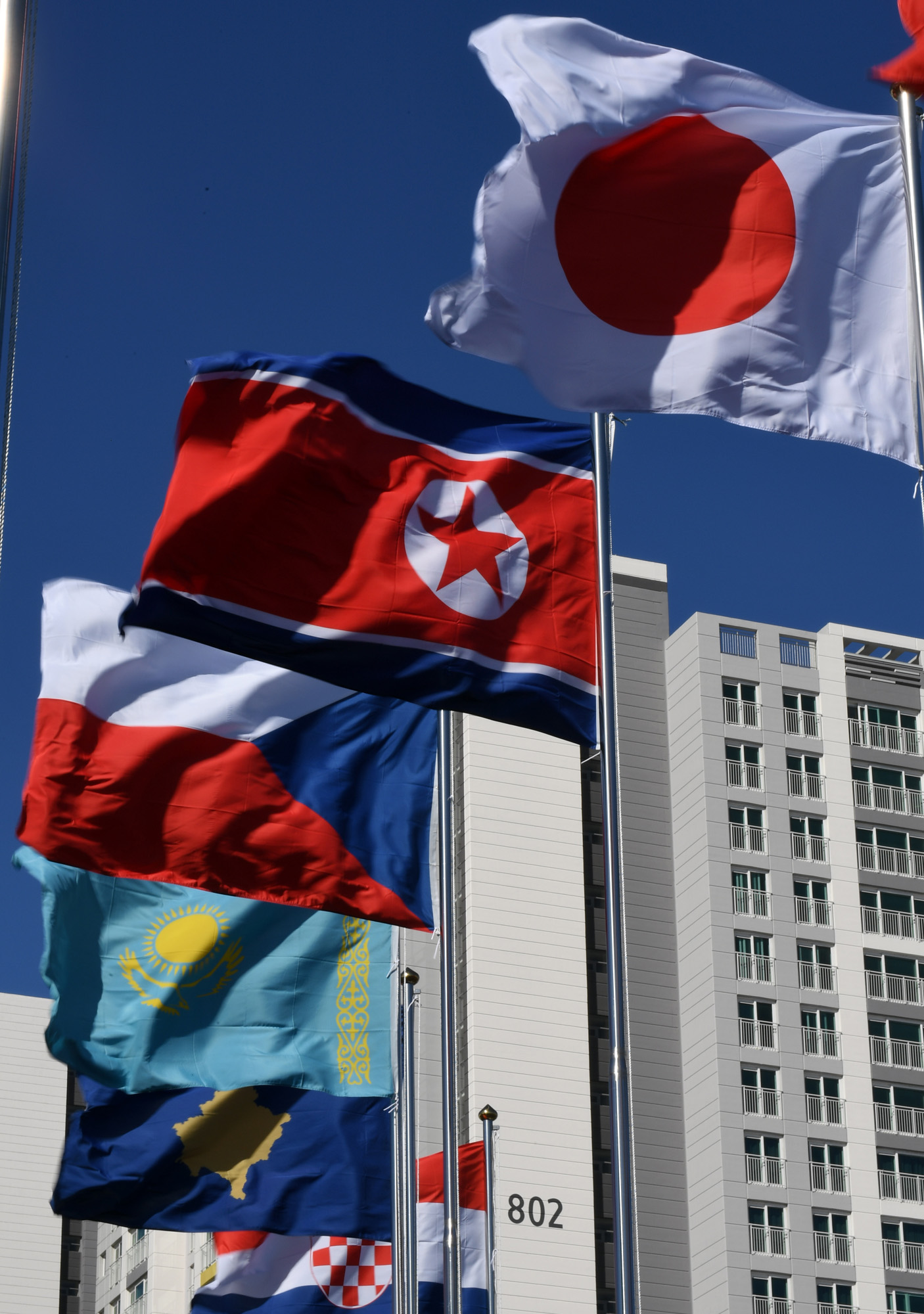 2018평창동계올림픽 개막 D-8일인 1일 오후 강원도 강릉선수촌에는 북한의 인공기가 휘날리고 있다./강릉=임영무 기자=사진공동취재단