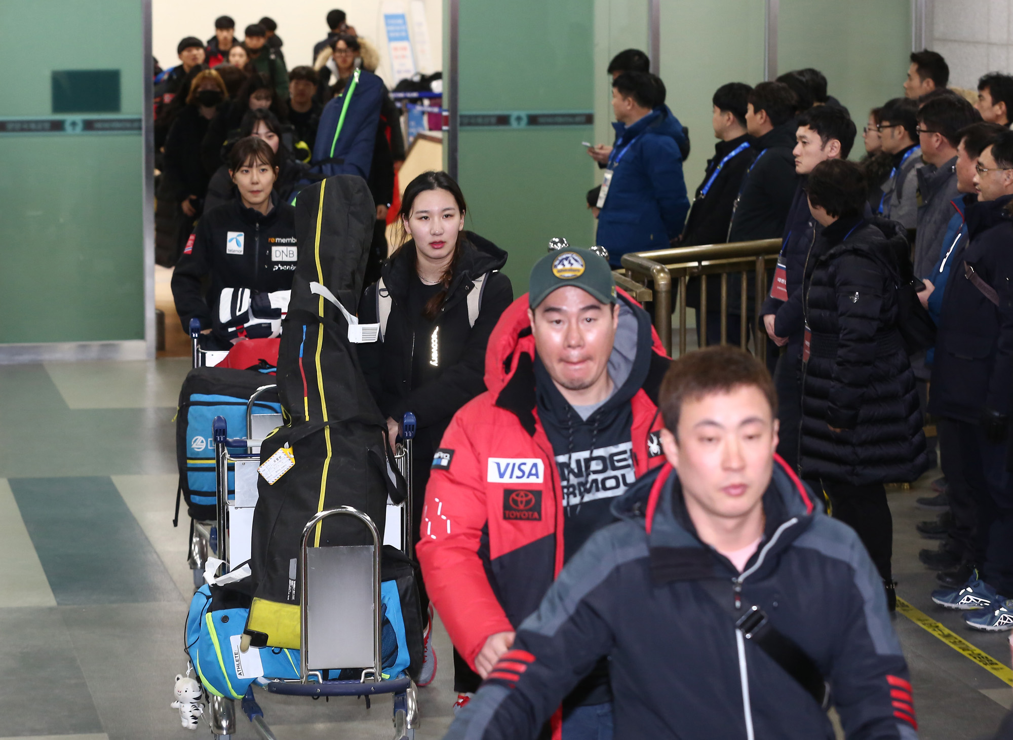 1일 오후 마식령스키장에서 남북 공동훈련을 마친 남측 선수단과 양양공항을 통해 입국하고 있다.