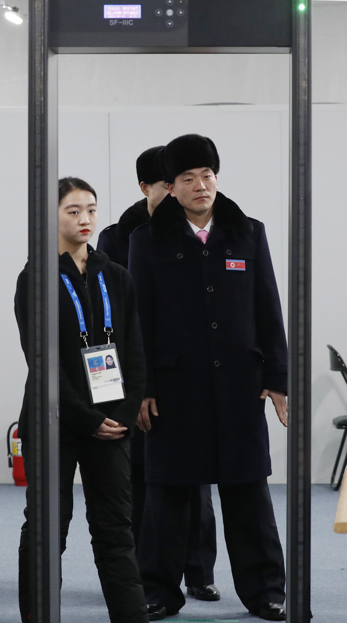 1일 오후 원길우 체육성 부상이 이끄는 북측 평창동계올림픽 참가 선수단이 강릉 선수촌에 입촌하기 전, 보안검색을 받고 있다.